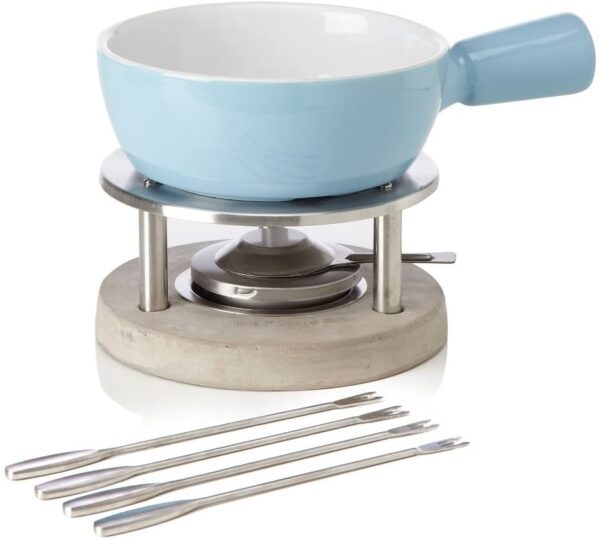 Setul de fondue include: oală ceramică, bază de beton, 4 furculițe pentru fondue din oțel inoxidabil, arzător